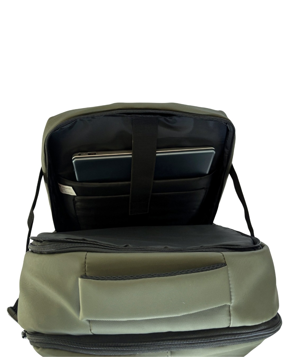 Color verde olivo, fabricado en material impermeable, incorpora expansión inteligente para aumentar la capacidad. Cuenta con compartimento para laptop, múltiples compartimentos internos para organización, bolsillo anti-líquidos y puerto de carga integrado para dispositivos electrónicos. Diseño ergonómico, resistente y funcional, pensado para viajes, trabajo y uso diario.
